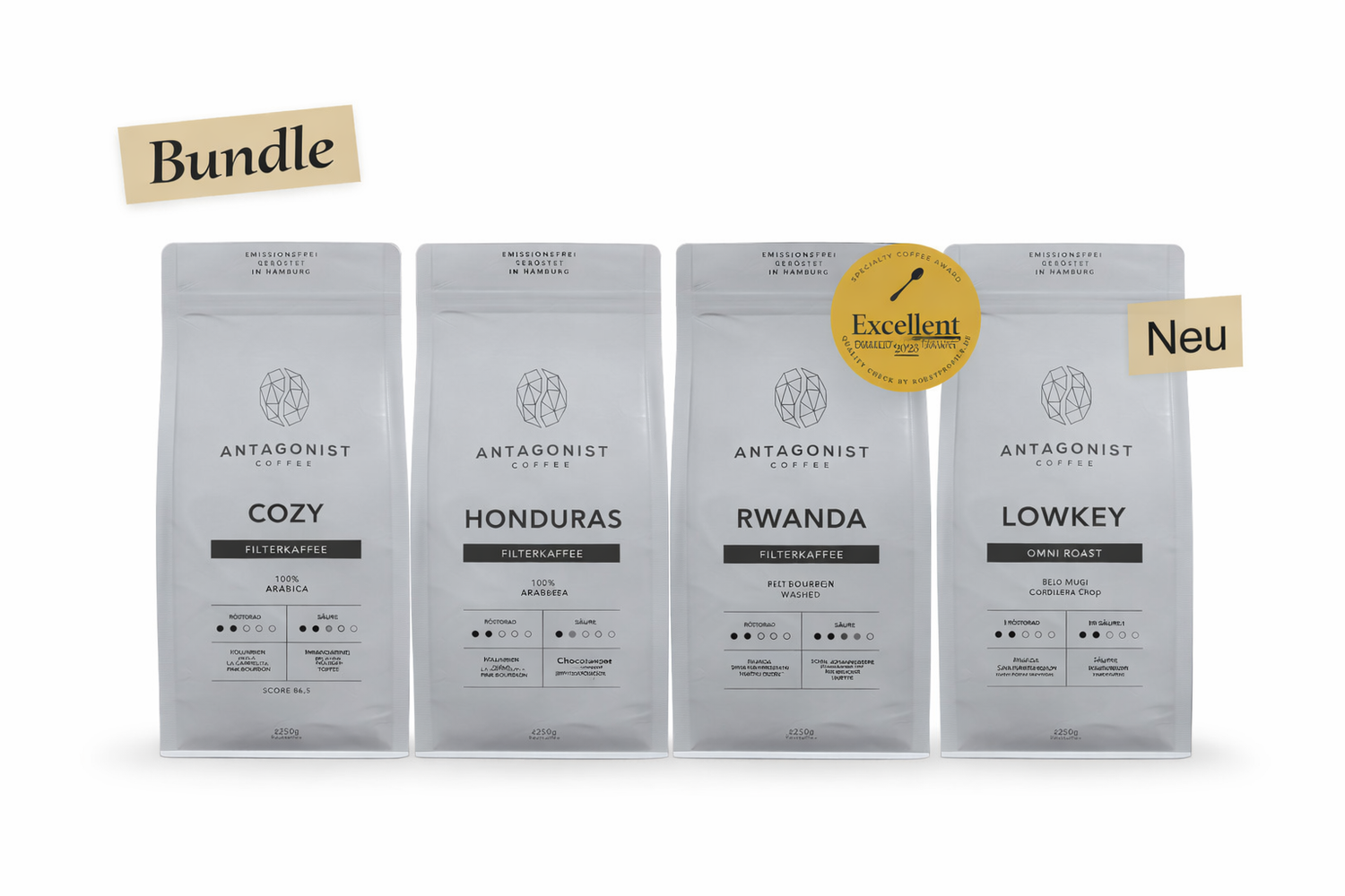 Antagonist Coffee Probierpaket Filterkaffee 4 x 250g, 4 Kaffeesorten gemischt - Schokoladig bis Fruchtig