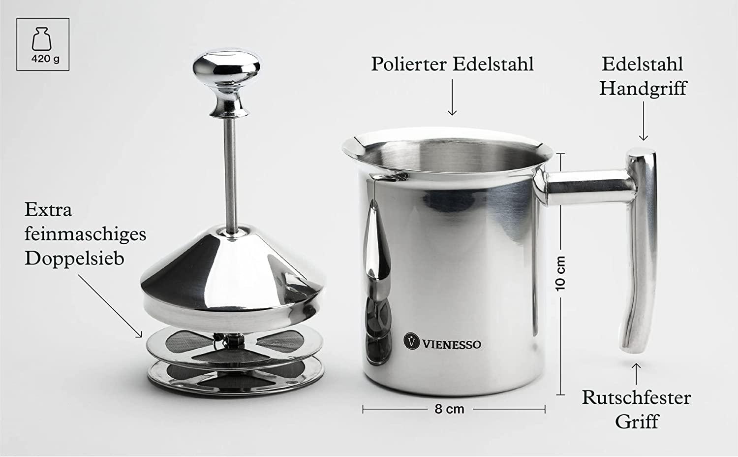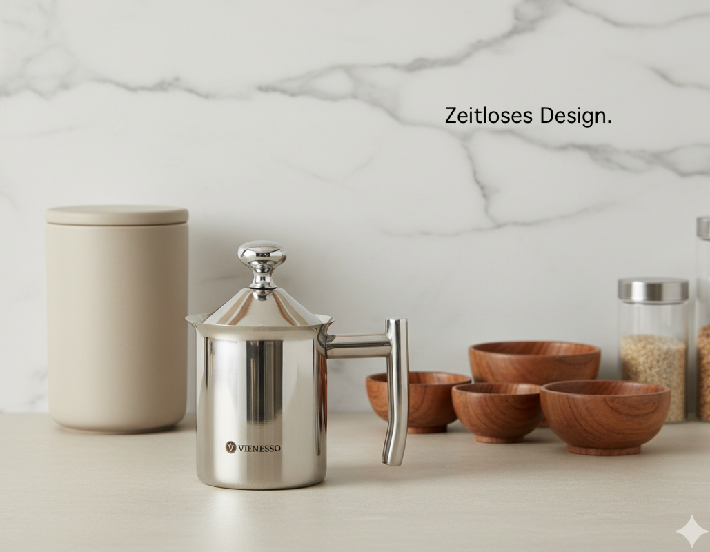 • Der Manuelle Milchschäumer ist gefertigt aus reinstem Edelstahl mit poliertem kratzfestem Hochglanz-Finish im edlen Vienesso Design. Rostfreies Material, langlebig und ergonomischer hitzebeständiger Handgriff mit spritzdichten Deckel.