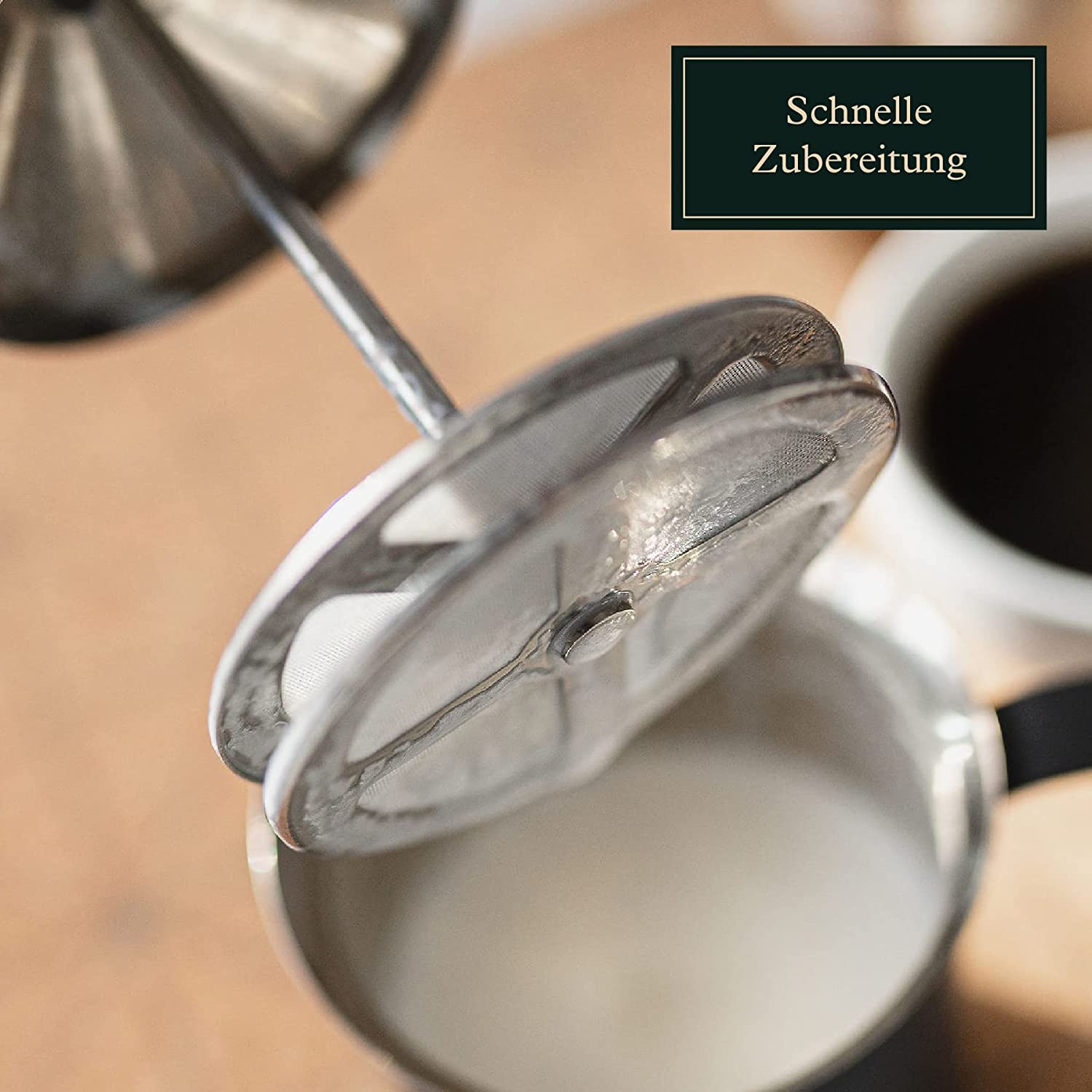 • Dank des Mesh-Aufsatzes stellen Sie innerhalb von 30-60 Sekunden durch einfache Auf- und Abbewegung des Griffes leichten, cremigen Milchschaum für ihr Kaffeegetränk oder ihre heiße Schokolade her.