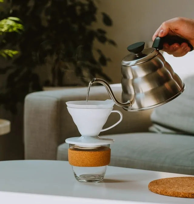 La carafe à café HARIO V60 s'utilise avec le goutteur V60. Placez le goutteur sur la carafe, ajoutez le filtre et le café en poudre et versez de l'eau chaude sur la poudre. La carafe récupère le café fraîchement moulu et le garde au chaud.