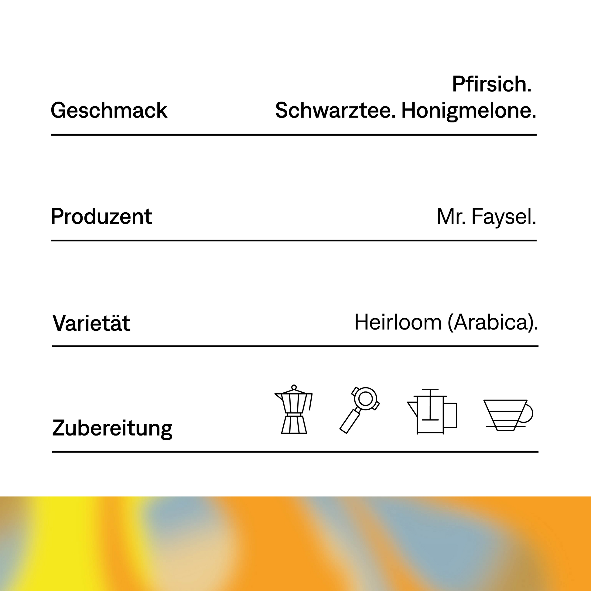 Die Region Bombe gilt als echtes Qualitätssiegel innerhalb der Sidama-Zone. Dieser Kaffee stammt aus der Washing Station Ayla, die nach der Nichte des Gründers Faysel A. Yonis benannt ist. Mit seiner Arbeit bei Testi Coffee setzt er seit Jahren neue Maßstäbe für äthiopischen Specialty Coffee.