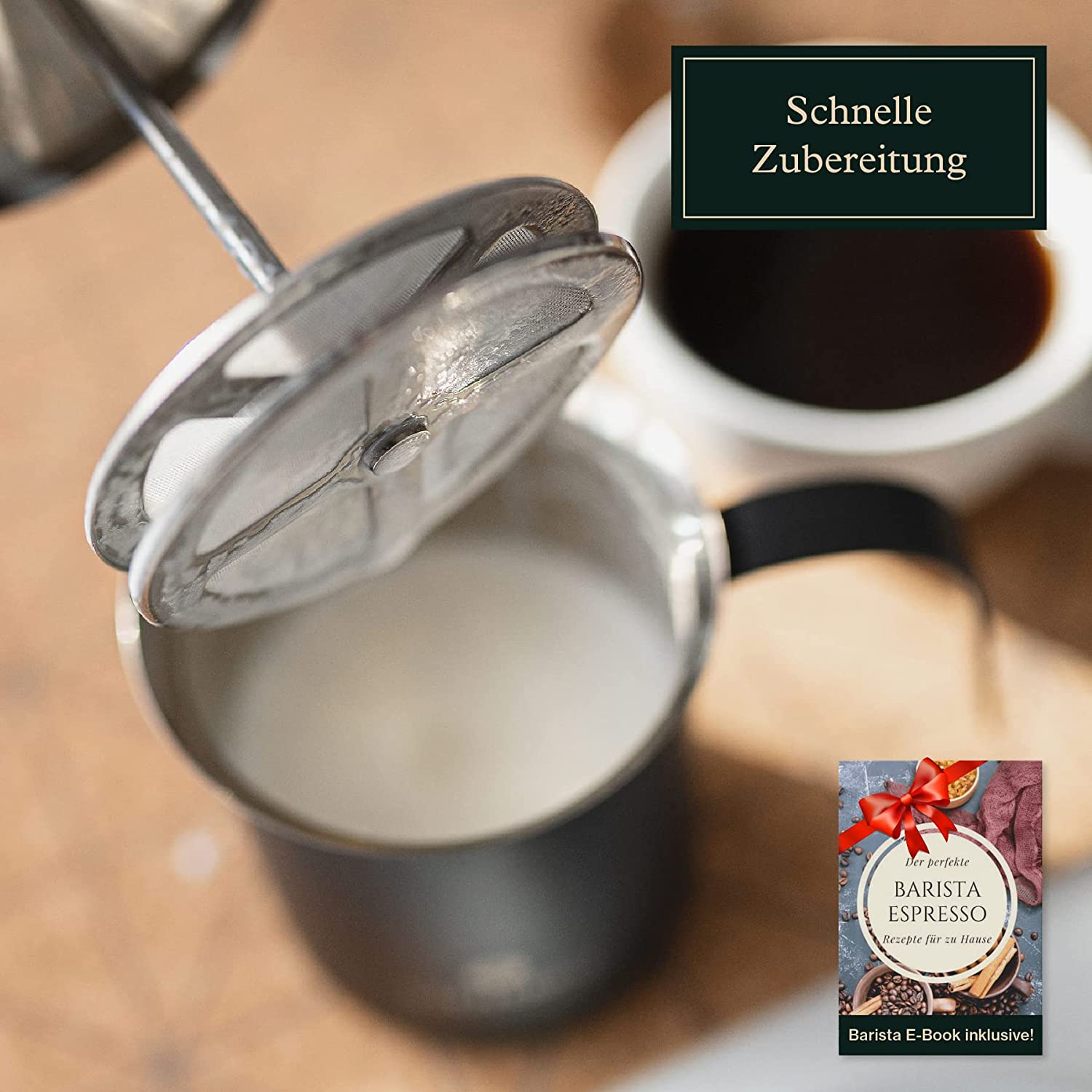 Hohe Funktionalität: Dank des Doppel-Mesh-Aufsatzes stellen Sie innerhalb von 30-60 Sekunden durch einfache Auf- und Abbewegung des Griffes einen leichten, cremigen Milchschaum für ihr Kaffeegetränk.