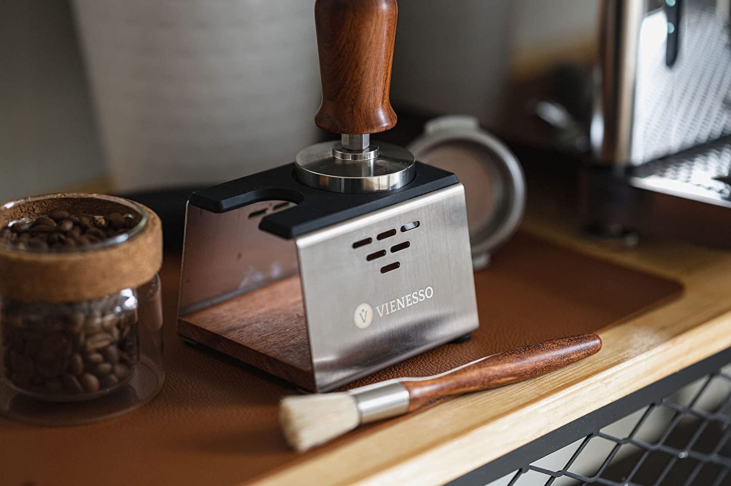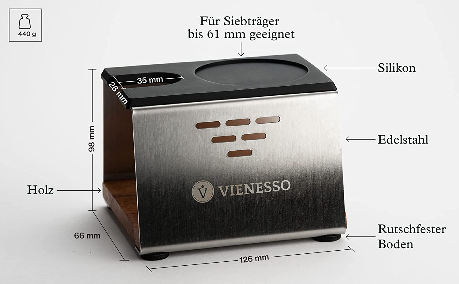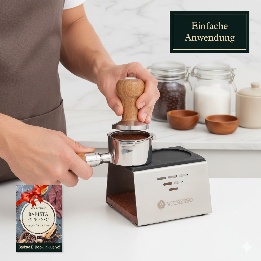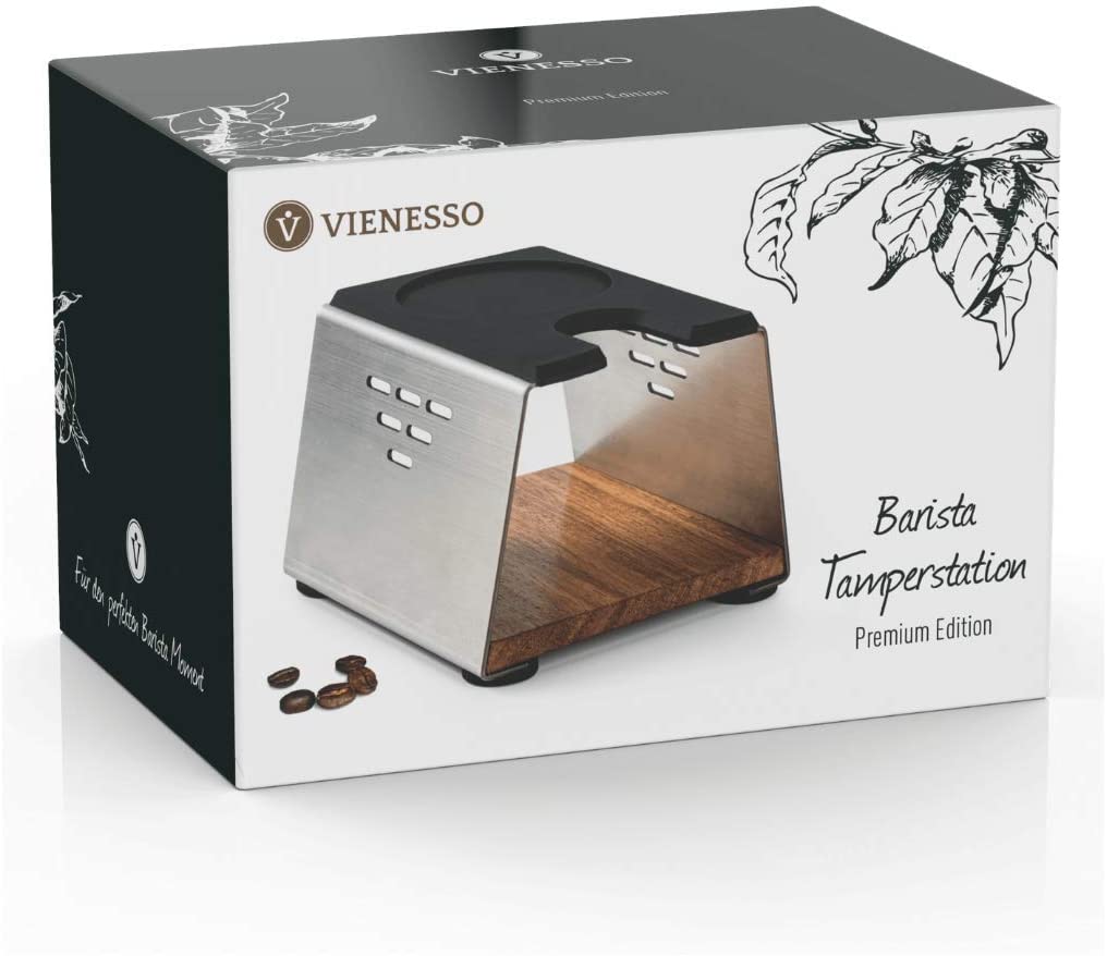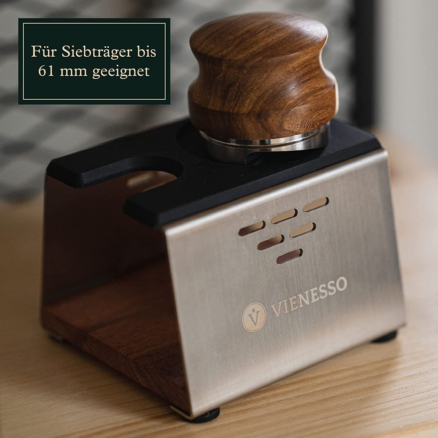 • Vienesso Tamperstation: Mit der Andrückstation kreieren Sie den perfekten Espresso! Nutzen Sie die Tampingstation einfach um das Kaffeepulver in Ihrem Sieb mit dem Tamper anzudrücken.
